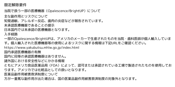 - ホワイトニングジェルは、当院の歯科医師が判断のもと、患者様本人へお渡ししております。転売行為や他人(親族も含む)への譲渡は絶対にお控えください。